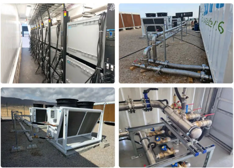 To meet these environmental requirements, DCX designed and delivered a fully integrated, containerized immersion-cooling platform engineered for extreme climate operation. The system integrates PRO9 immersion enclosures inside a reinforced ISO-grade container, configured for a total system capacity of 1.3 MW. Each immersion tank supports high-density mining hardware, submerged in dielectric coolant to eliminate thermal cycling, protect electronics from dust and sand, and significantly reduce mechanical wear. The container houses industrial-grade coolant distribution manifolds, sealed power busways, and fully redundant pumping modules for continuous operation in sand-laden environments.